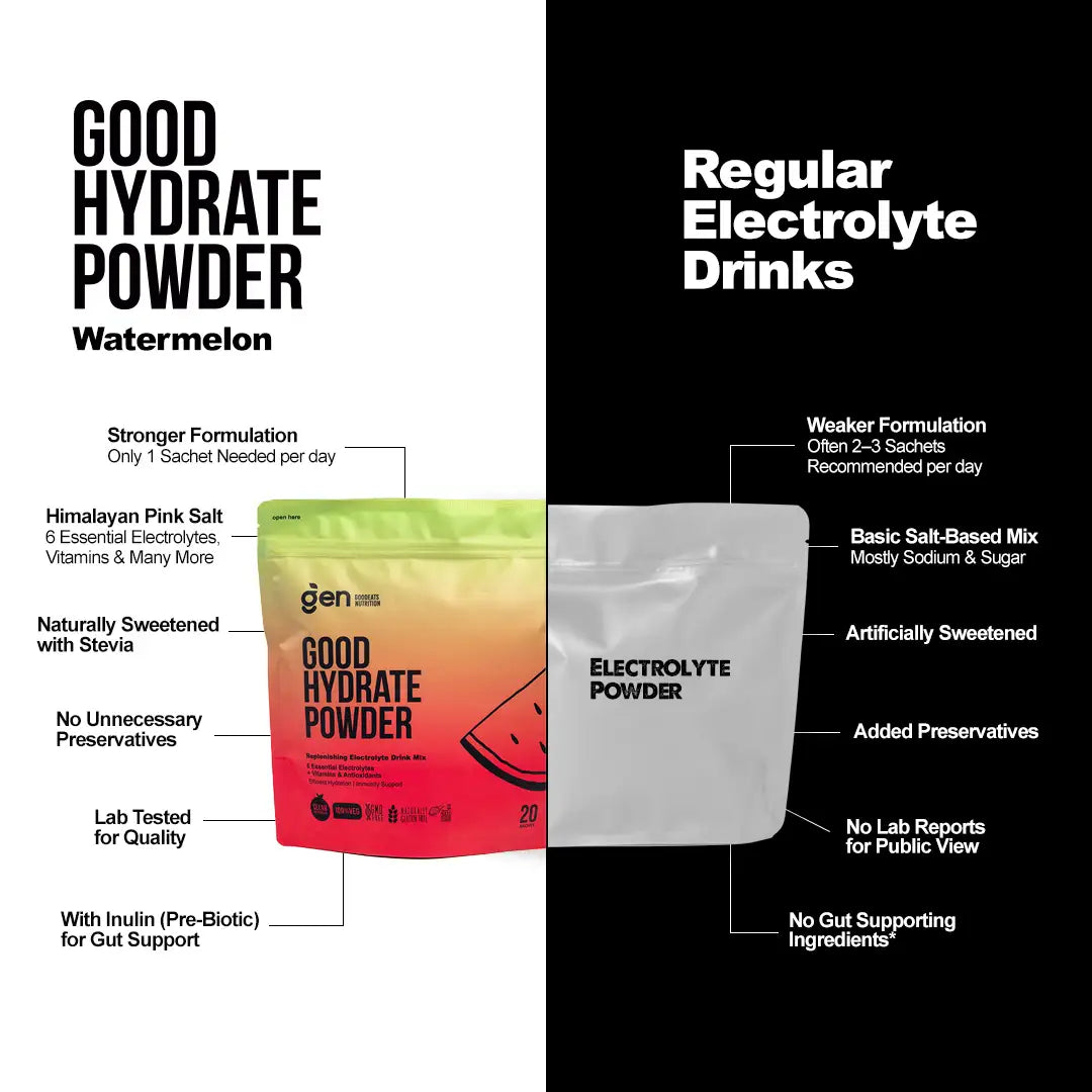 The UAE heat doesn't wait. And neither should your hydration. GoodHydrate has Himalayan Pink Salt, 6 essential electrolytes, Vitamin C, B12, Inulin (prebiotic fibre) and Stevia in a single sachet — designed to replenish what heat, movement, and long days take out.